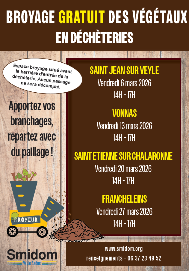 ActualitésBroyage gratuit des végétaux en déchetterie Publié le 26 février 202626 février 2026 par Conseil municipal 26 Fév Apportez vos branchages, repartez avec du paillage ! Conseil municipal Changement des horaires d’ouverture au public de la mairie Chasse aux oeufs frais