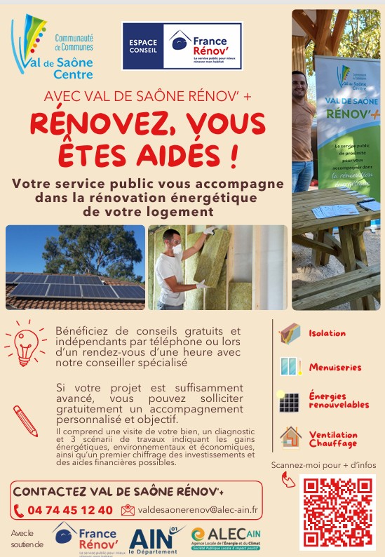Val de Saône Rénov’+ est le service public d’information, de conseil et d’accompagnement à la rénovation des logements, porté par la Communauté de Communes.